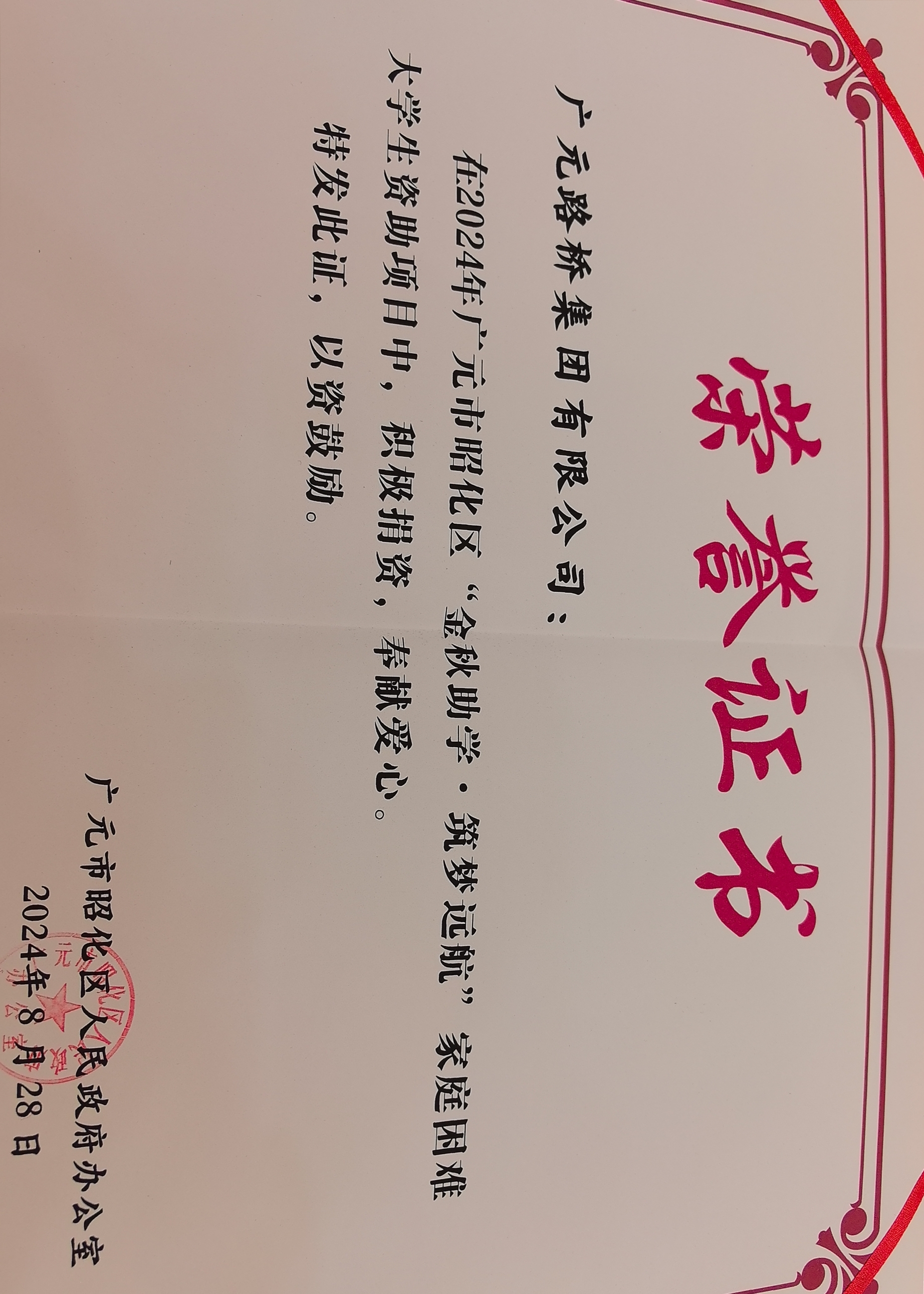 8月28日,昭化區(qū)舉行2024年“金秋助學·筑夢遠航”家庭困難大學生資助儀式,路橋集團作為資助企業(yè)參會并獲得表彰。