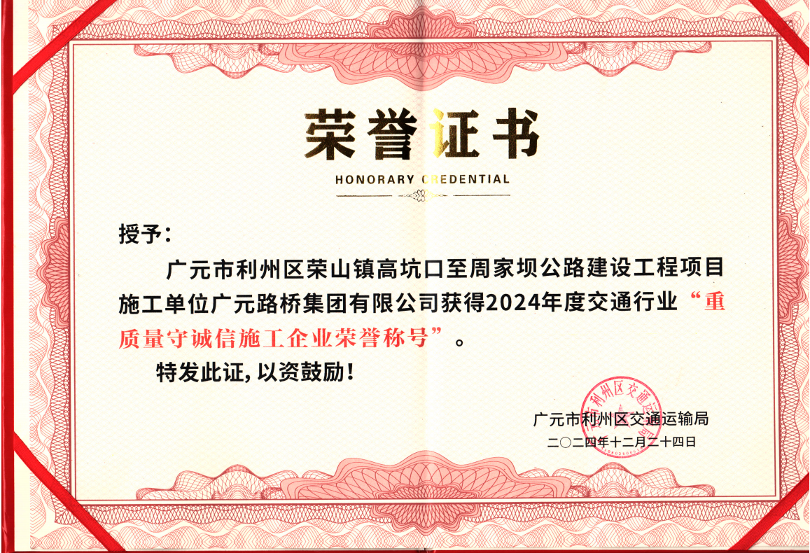 2024年12月24日,路橋集團(tuán)受到利州區(qū)交通運輸局表揚,榮獲“2024年度交通行業(yè)重質(zhì)量守誠信施工企業(yè)”榮譽稱號,路橋集團(tuán)榮山鎮(zhèn)高坑口至周家壩項目部在工程建設(shè)全過程中,始終以認(rèn)真細(xì)致、嚴(yán)謹(jǐn)高效的工作態(tài)度完成各項施工任務(wù),以實際行動詮釋“重質(zhì)量、守誠信”的精神內(nèi)涵。